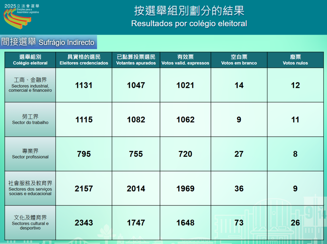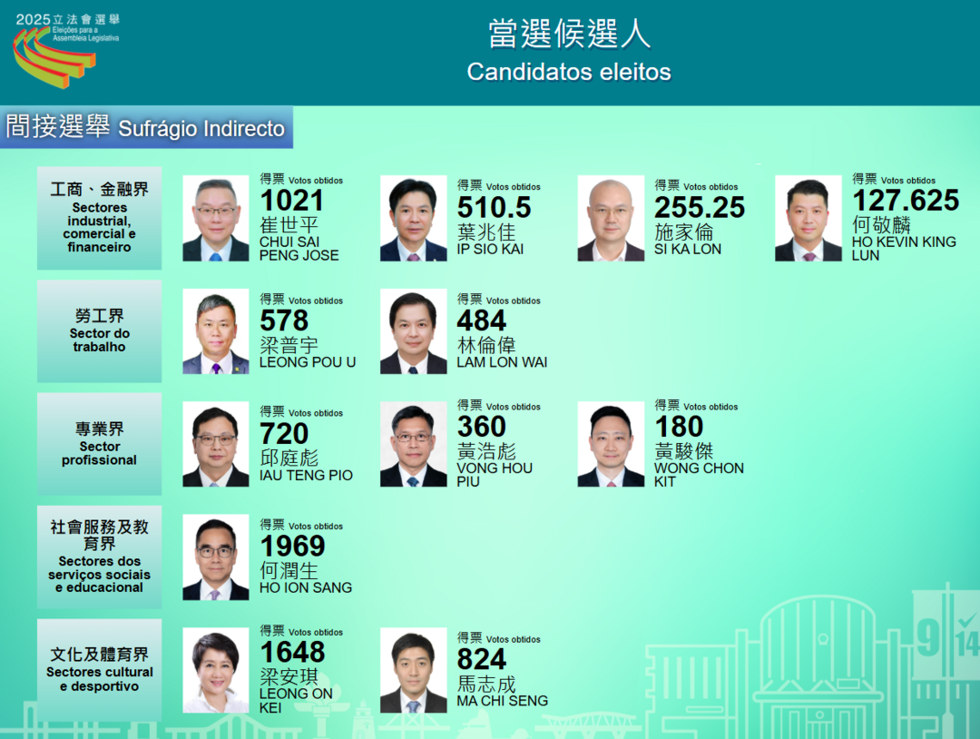 【大灣區時報消息】選管會公佈間選點票結果,當選候選人分別為:崔世平、葉兆佳、施家倫、何敬麟(工商、金融界);梁普宇、林倫偉(勞工界);邱庭彪、黃浩彪、黃駿傑(專業界);何潤生(社會服務及教育界);梁安琪、馬志成(文化及體育界)。