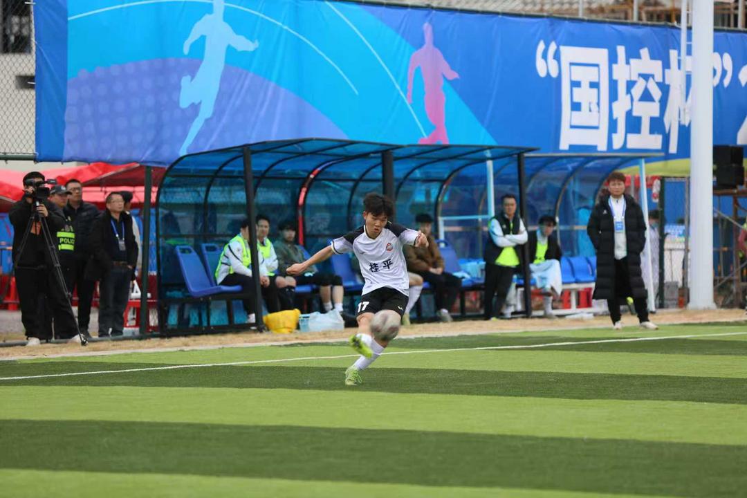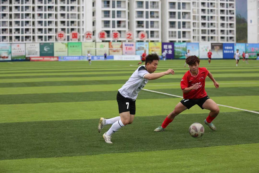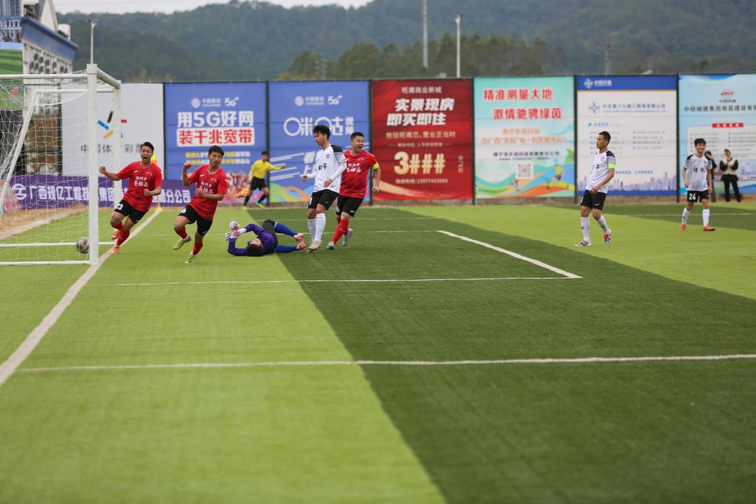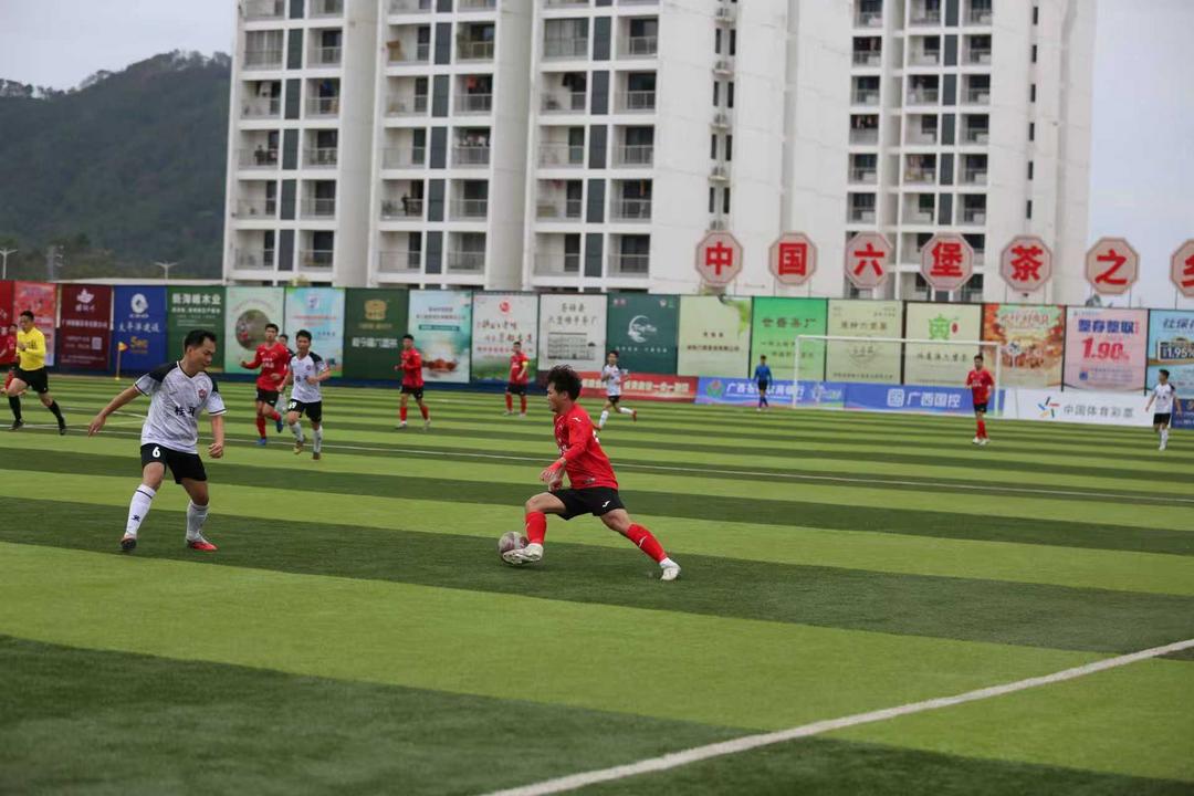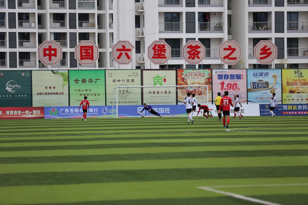 “球进了!”1月31日,苍梧县石桥镇东安社区体育休闲公园足球场爆发出雷鸣般的欢呼。梧州市苍梧县六堡茶队抓住进攻契机,团队间流畅配合,队员接球后顺势破门得分。