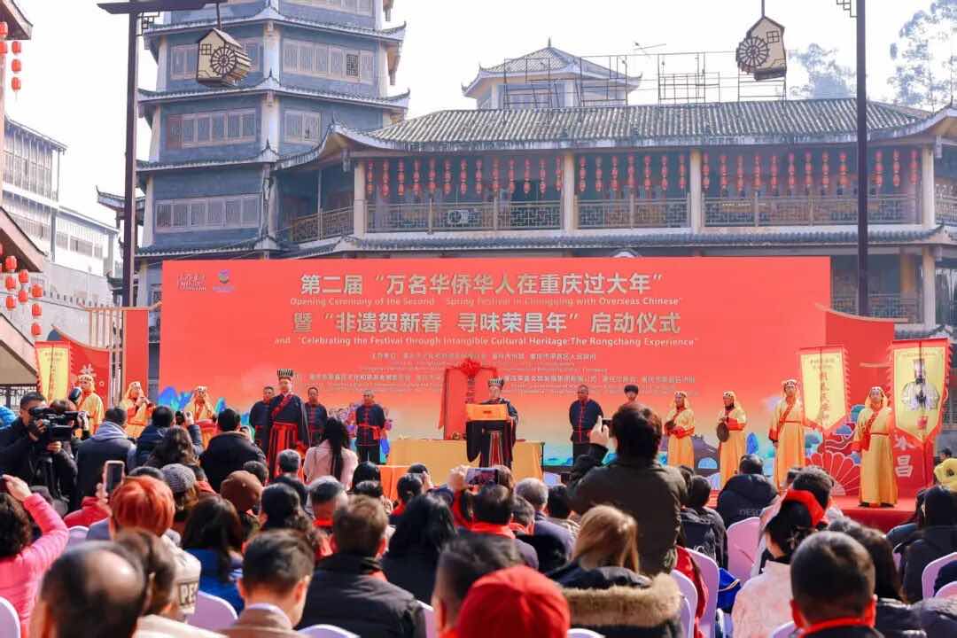 (大湾区时报重庆讯)2026年2月11日农历南方小年,作为“向世界讲述重庆”系列活动之一,第二届“万名华侨华人在重庆过大年”活动在荣昌万灵古镇启幕。本次活动由市文化旅游委、市侨联、荣昌区人民政府联合主办,市卫生健康委支持,以“中国年 重庆味” 为主线,为华侨华人量身定制的“欢乐春节”主题活动。来自英国、德国、澳大利亚等10余个国家和地区的近200位华侨华人与重庆市民欢聚一堂,共赏传统习俗,共迎新春盛景。