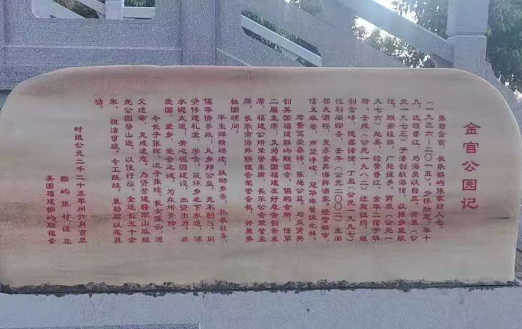 (大湾区时报福州讯,特约记者 纽约墨人 报道) 2026年3月11日,福建省福州市长乐区猴屿乡猴屿张家村迎来一件温暖人心的喜事——承载乡情与孝心的 金官公园 正式落成启用。公园依山而建,绿意盎然,不仅为当地乡亲增添了一处休闲健身、邻里交流的公共空间,也寄托着人们对美国福建猴屿联谊会名誉主席张金官先生的深切缅怀与崇高敬意。