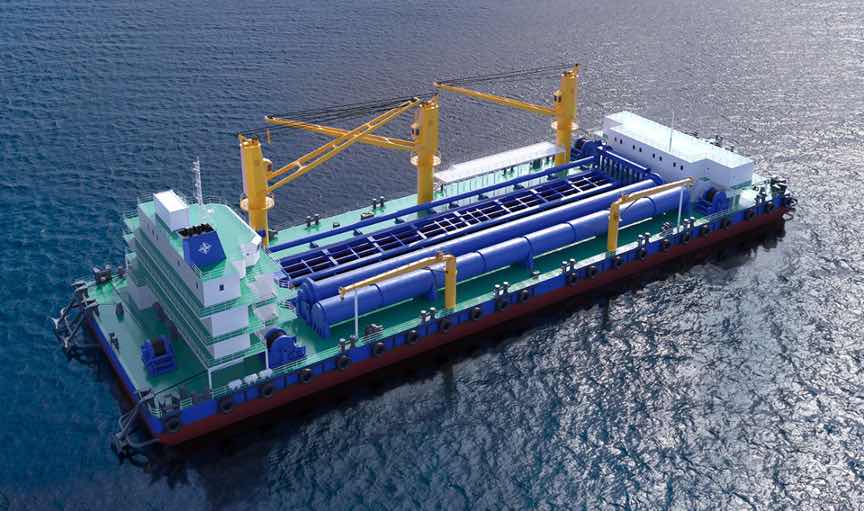 本次开工建造的60米滚筒铺排船总长105米、型宽32米、型深6米、设计吃水4米。船舶采用新型内置翻板铺排结构,搭载铺排作业自动控制系统,可实现铺排全过程协同控制,满足60米宽、300米长深水软体排的精准铺设。该船同时装配储能系统,能够大幅度提升船舶的运营效能和绿色环保能力,是目前国内铺排能力最强、结构最新颖的绿色智能铺排船。