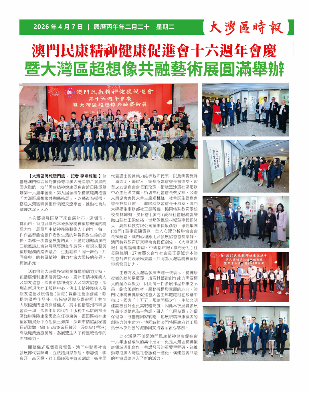 (大灣區時報澳門訊, 記者 李翔 澳門報道 )為響應澳門特區政府推動粵港澳大灣區融合發展的國家戰略,澳門民康精神健康促進會近日隆重舉辦第十六週年會慶、第九屆領導架構就職典禮暨「大灣區超想像共融藝術展」,以藝術為橋樑,搭建大灣區精神復康領域交流平台,推動社會共融理念深入人心。
