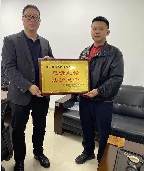 这天,海丰县联源五金饰品有限公司经理来到海丰县人民法院,专程赠送“息诉止讼、法护民企”牌匾,对该院民事庭法官周到、悉心的调解工作表示感谢。