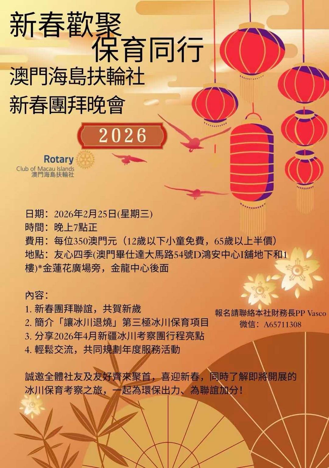 (澳門,2026年2月25日)大灣區時報 李翔 報導 澳門海島扶輪社今日假紅樹林海鮮火鍋舉辦「新春團拜晚會」,以「新春歡聚 x 保育同行」為主題,匯聚港澳兩地扶輪社友及嘉賓共32人,在《扶輪頌》的歌聲中拉開序幕,喜慶熱鬧之餘,亦聚焦環保與服務議題。