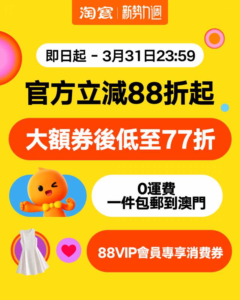 三月正是煥新的最佳時節,淘寶澳門站透過「新勢力週」與「春季家裝節」的聯動,將服飾潮流與家居升級兩大需求有機結合,配合本地化的物流與支付體驗,為澳門消費者帶來真正一站式、無門檻的春日購物體驗。無論是追求個性穿搭的年輕一族,還是注重生活品質的家庭用家,都可於活動期間找到專屬的煥新靈感。立即打開淘寶App切換至澳門站,或瀏覽官方網頁,率先鎖定心水好物!