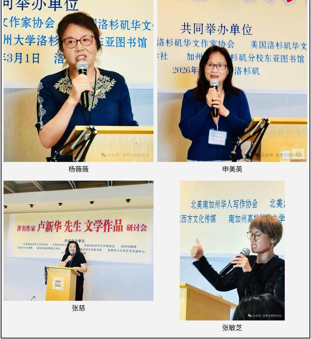 随后,多家联合主办单位负责人依次上台致辞,包括北美南加州华人写作协会会长严筱意、北美洛杉矶华文作家协会会长张五星、美国洛杉矶华文作家协会会长王伟、《洛杉矶邮报》董事任向东、东西方文化传媒总编段金平、南加州高校联盟文学社社长李学以及加州大学洛杉矶分校东亚图书馆馆长陈肃等。各界代表纷纷向卢新华表示祝贺,并肯定其作品在海外华文文学发展中的独特意义。