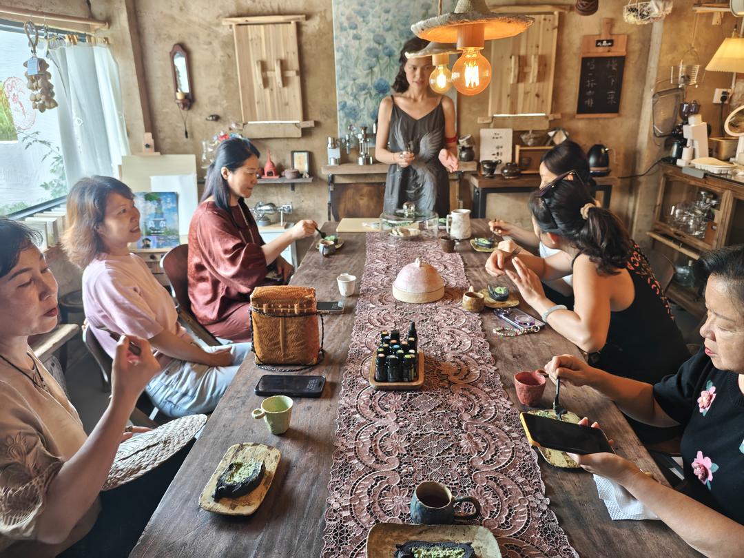而作为本次沙龙的举办场地,王伯杨工作室也为活动增添了浓郁的文化底蕴。工作室以“桂林柚罐、桂林漆器、东山窑”三大特色产品闻名,每一件作品都凝聚着传承人的匠心与智慧。王伯杨先生,这位身兼桂林市政协委员、桂林漆器与桂林柚器制作技艺自治区非遗传承人、国家级乡村工匠名师数职的文化传承者,与夫人一同,用独具艺术特色的东山窑器制作出冰镇咖啡和绿茶糕点,让嘉宾们在品味自然香气的同时,也能享受到一场视觉与味觉的双重盛宴。