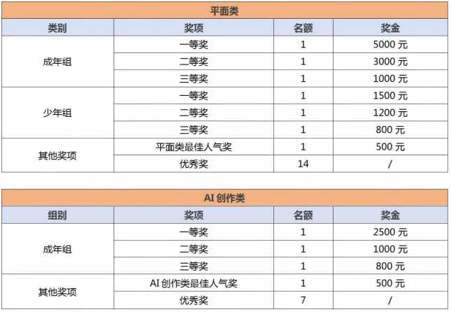 1.平面类(设成年组及少年组):包括报纸广告、海报设计、漫画作品等(禁止使用AI创作)。
