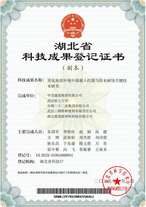 近日,中交建筑集团第二工程有限公司申报的《劣化地质环境中混凝土控裂与防水耐蚀关键技术研究》通过湖北省科学技术厅评审,获得2024年度湖北省科技成果“国际先进水平”。