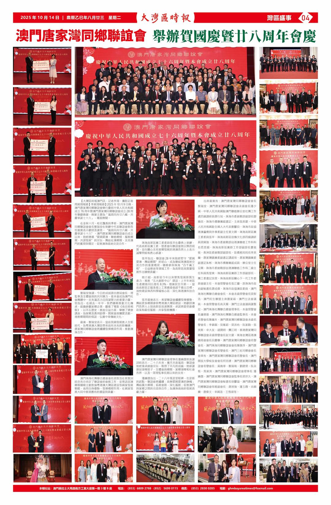 【大灣區時報澳門訊,記者李翔、攝影記者周展翔報道】2025年10月9日晚,澳門唐家灣同鄉聯誼會舉行慶祝中華人民共和國成立76周年暨澳門唐家灣同鄉聯誼會成立28周年聯歡晚宴,晚宴主題為「風雨同舟廿八載,共慶華誕七十六」,場面熱鬧。