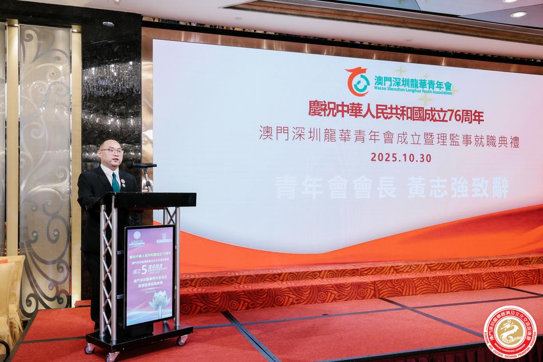 張志堅致詞表示,過去五年,在理監事、會員及社會各界的支持下,該會秉持愛國愛澳宗旨,會員從百多人增至五百多人,舉辦超過一百十五場交流活動。多次組織赴深圳龍華考察,推動兩地大學合作、舉辦科技論壇及跨境電商峰會等。在文化和國情教育方面,組織參觀國安展、建黨百年圖片展,舉辦大灣區兒童繪畫比賽及澳門家庭自駕遊活動。在公益服務與青年培養上,開展慈善敬老活動,服務居民超三千人次。針對青年群體,不僅舉辦跨境電商培訓、創業講座,更組織青年龍華實習、運動交流比賽,惠澳政策宣講等,助逾千名青年明晰發展方向,更好融入國家發展大局。
