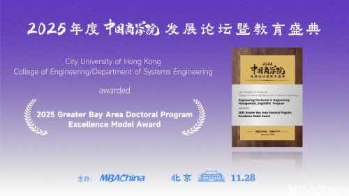 11月28日,由MBAChina与《经理人》杂志联合主办的“2025年度中国商学院发展论坛暨教育盛典”在北京启幕,“2025年度大湾区博士项目卓越典范奖”榜单正式发布,香港城市大学工程学院系统工程学系工程博士项目荣获2025年度大湾区博士项目卓越典范奖。