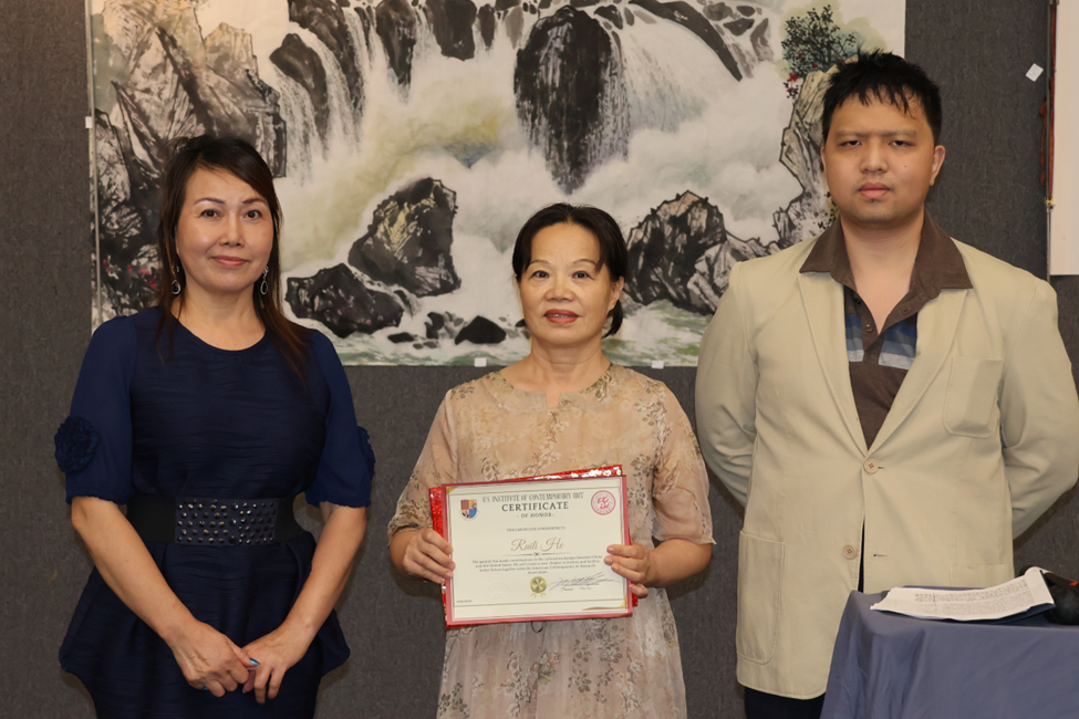 活动由双语主持人、也是云南人南林主持。美国当代艺术研究会会长王敏、副会长John首先致辞,并代表主办方向艺术家何瑞丽颁发证书。联合主办方史坦福领袖教育学校校长、国际狮子会D4 L2大洛杉矶圣盖博区主席杨士慧(Angie Yang)也到场致意。