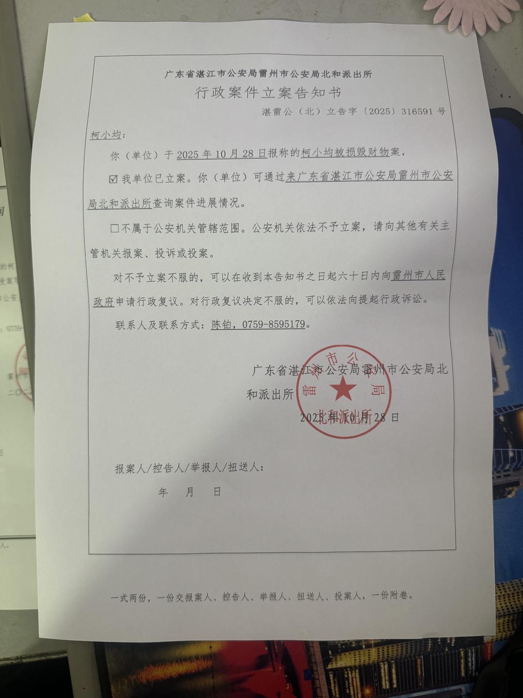 10月28日上午,北和派出所向报案人柯小均(柯永良堂弟)出具《行政案件立案告知书》(湛雷公(北)立告字〔2025〕316591号),案由"故意损毁财物",案件编号A4408826900002025106014,主办民警陈铂。