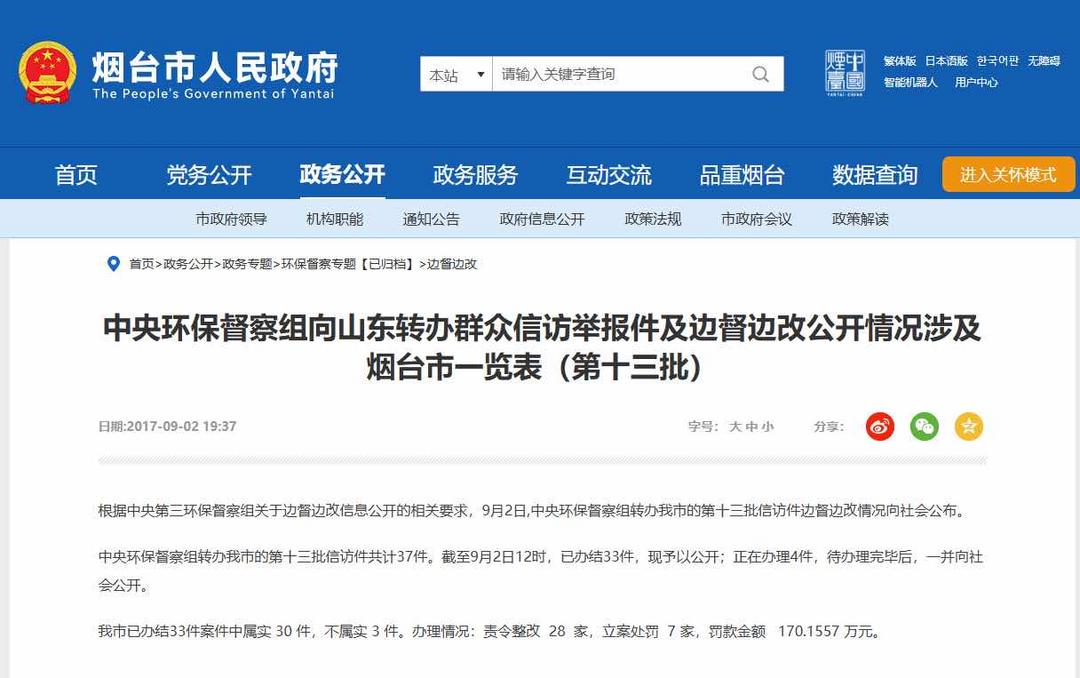 相关问题在(https://www.yantai.gov.cn/art/2017/9/2/art_12304_1130557.html)中央环保督察组向山东转办群众信访举报件及边督边改公开情况涉及烟台市一览表(第十三批)公示中得到印证。