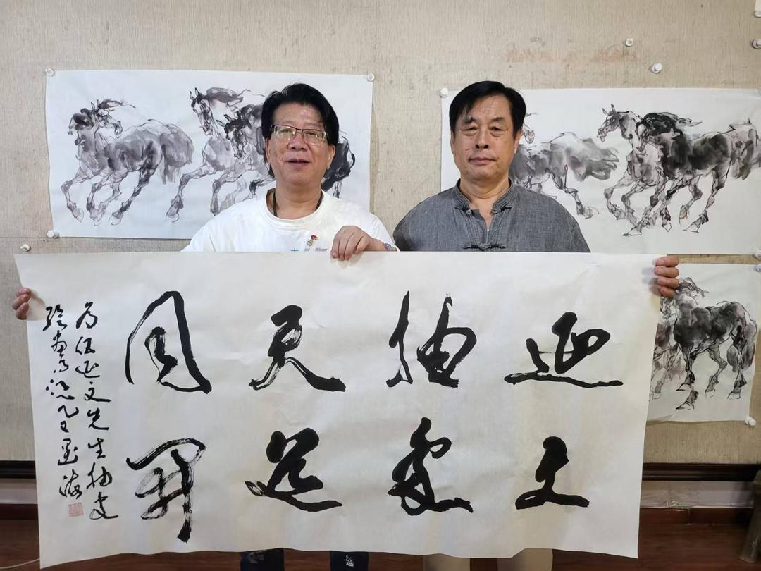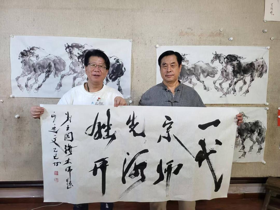 2025年9月18日中国著名“怪才”艺术家伍延文与新汉画水墨开宗派王阔海终于在北京相聚了,两人成为传统突破者与当代抽象领军者的互相激励与挚友。伍延文的意念能量开宗派与王阔海的新汉画水墨开宗派形成艺术理念互补,共同推动新时代艺术发展。2025年两位大师首次以两人互免互赠书法为契机(备注:伍延文老师为王阔海老师题写“一代宗师 先河独开”,而王阔海老师为伍延文老师题写“延文抽象 天道同开”),展现他们既鼓励又合作的独特友谊。