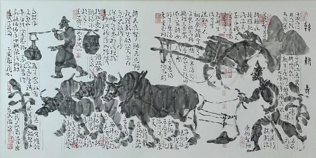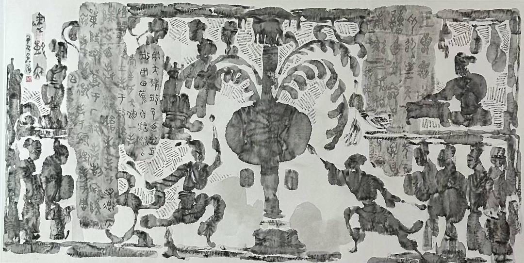 王阔海将汉画像石刻艺术转化为水墨形态,融合浮雕、壁画、剪纸等民间艺术精髓,开创了“新汉画”流派。其作品以古朴典雅、狂放精微的风格著称,被美术界誉为“王阔海的新汉画艺术”。