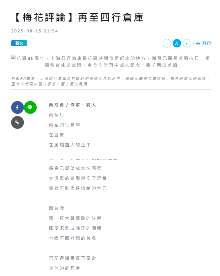 四行倉庫抗戰聖地·八百壯士氣貫長虹——商成勇詩歌作品選